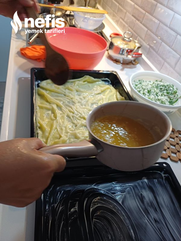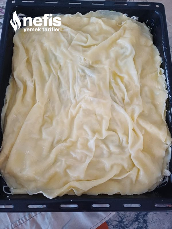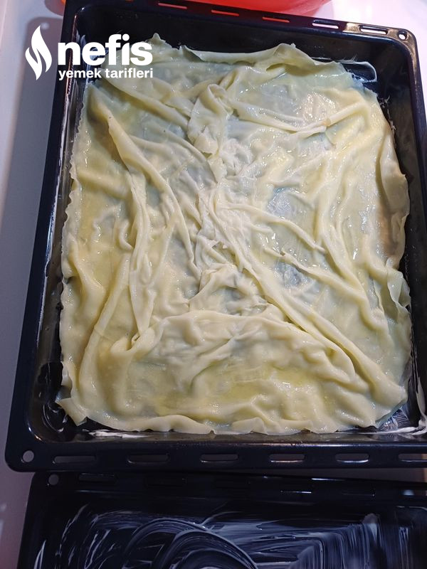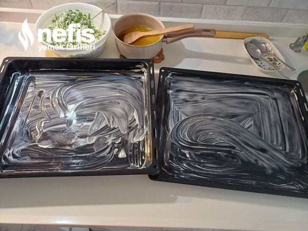 - Haşlanan yufkaları ortalarına yağ gezdirerek tepsimize serelim. 3. yufkadan sonra iç harcını koyalım.