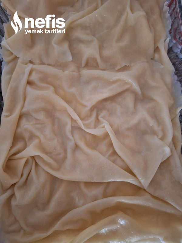 - Dinlenen hamurdan birinci beze ince bir biçimde açılır ve yağlanmış tepsiye serilir. En alt ve en üst hamur haşlanmayacak.