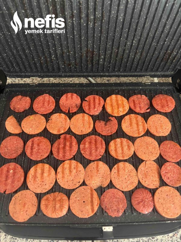- Sucuklarımızı dilimliyoruz tost makinasına diziyoruz hafif kızarmasını sağlıyoruz.