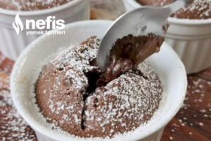 - Hafif yağlanmış 3 adet sufle kasemize hisse edelim, bir çay kaşığı tekrar ortasına sürülebilir çikolata koyun.