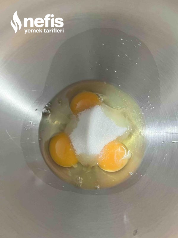 - Öncelikle 3 adet yumurtayı kırıyoruz ve şekerini ekleyip, karışım beyazlaşıp köpük köpük olana kadar çırpıyoruz.
