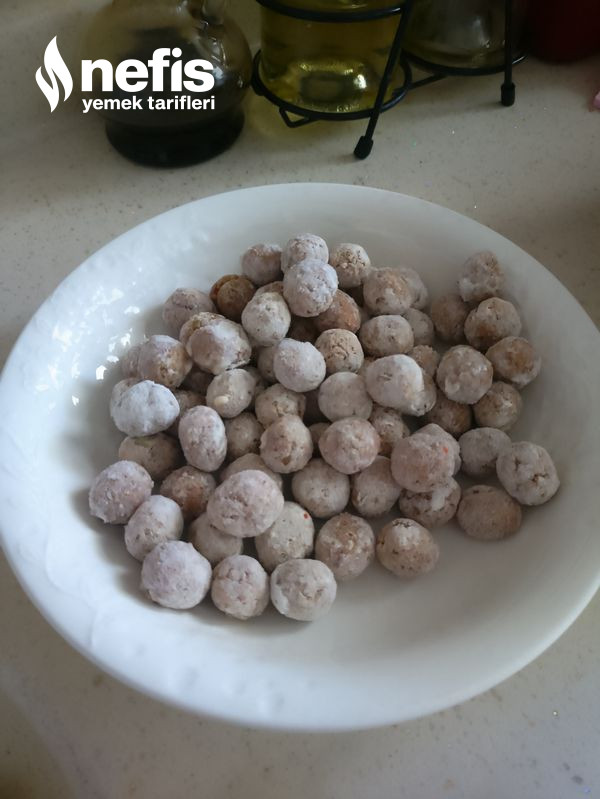 - Bir kasenin içine su alıp, elinizi ıslatıp, yapışmaması için yuvarlayabilirsiniz. Sıvı olabilir zira daha sonra yuvarladığımız misketleri biraz unlayıp buzlukta dondurabiliriz.
