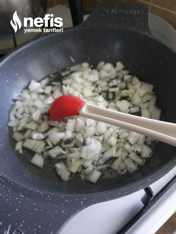 - Bir tavanın içerisinde yarım çay bardağı sıvı yağımızı alıp soğanımızla birlikte pembeleşene kadar kavuralım.