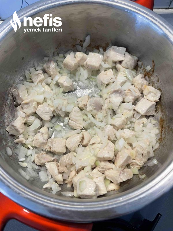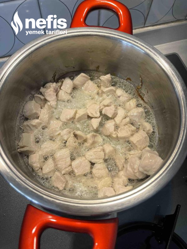1. İlk olarak tavuk göğsünü küp küp doğrayalım, tenceremize az yağ koyup tavukları ekleyelim suyunu salıp çekene kadar pişirelim.