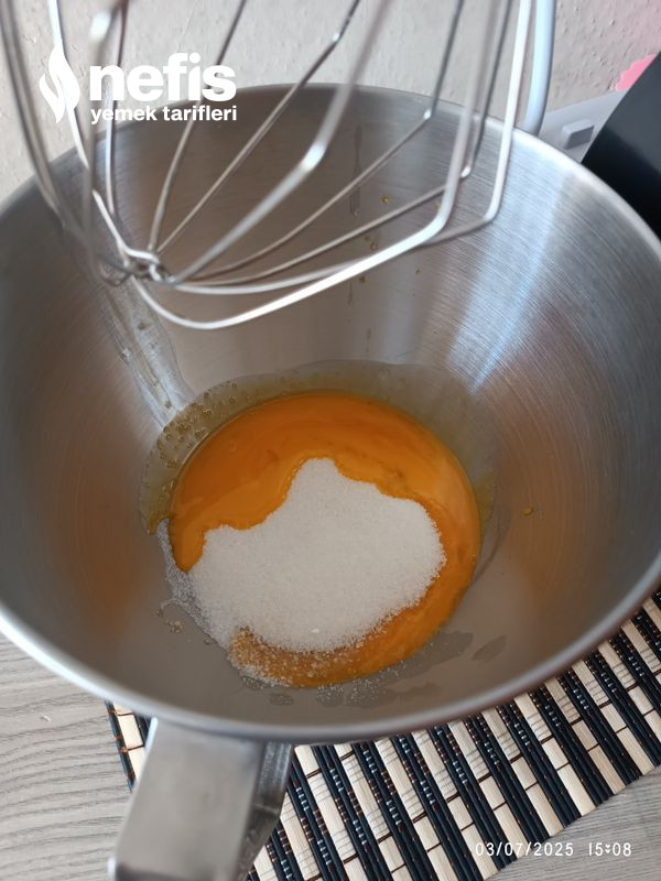 - Yumurtanın sarısını, beyazını ayırın, beyazını bir fiske tuzla kar haline getirin, sarısına şeker ekleyip yeterlice çırpın. Kalan malzemeyi ekleyip güzelce karıştırın bu karışımı beyazın üzerine dökün, spatulayla söndürmeden karıştırın.