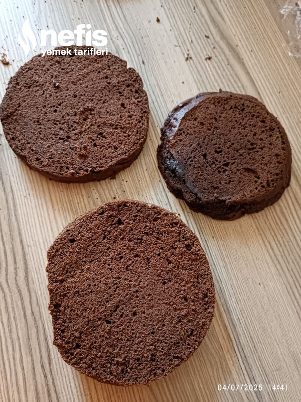 - Bütün gereç hazır olduktan sonra birleştirmemizi yapalım detaylı fotoğrafta koydum oradanda ilerleye bilirsiniz birinci evvel pandispanyamızı üçe bölelim eşit biçimde birinci katımızı çevirme kabına alalım, üstünü sütle ıslatalım.