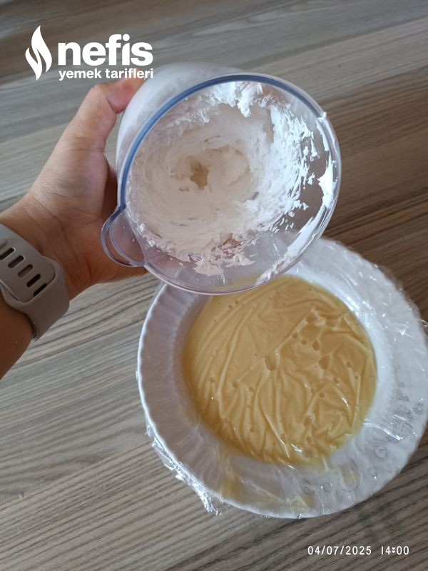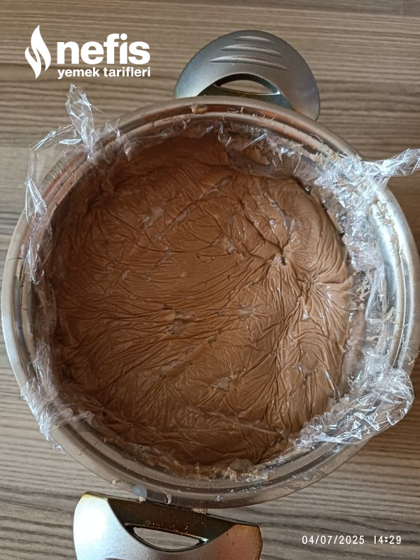 - Soğuduktan sonra üzerine streç sinemayla kapatalım hava almayacağı biçimde üstüne streç sineması büsbütün değdirerek kapatalım dolapta 1 saat kadar dinlendirelim o dinlenirken kremşantiyi yapalım onuda dolapta bekletelim.