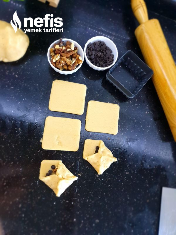 - Mektup zarfı formunda kapatılarak tepsiye dizilir. (dağılmaması için hamur kesme aparatıyla kaldırarak tepsiye dizelim)