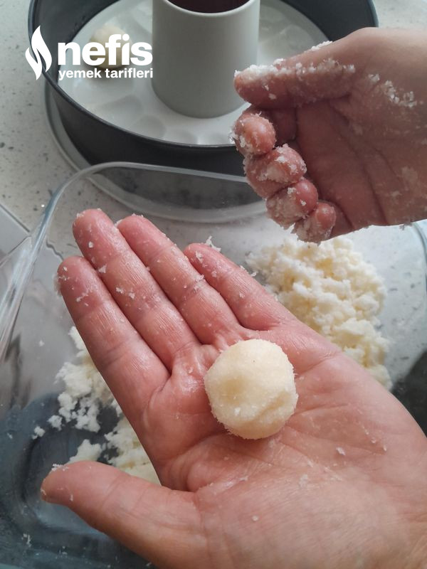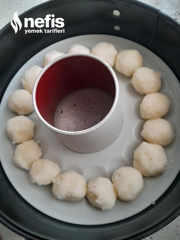- Öncelikle toplar için bir kaba yumurta akı ,hindistan cevizi ve pudra şekerini ekleyip karıştıralım ceviz büyüklüğünde modüller koparıp yuvarlayalım.