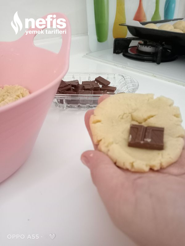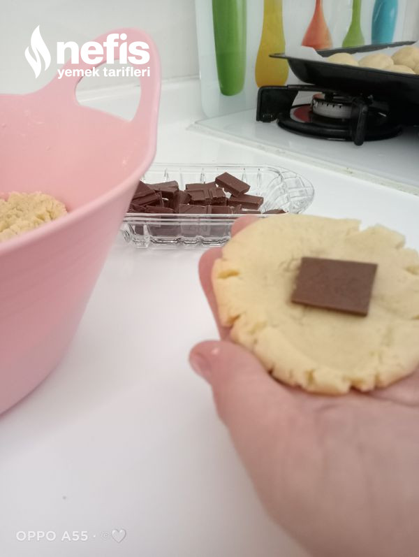 4. Elimizde kare çikolatalar varsa daha kolay yapabiliriz ,küçük küçük kırdıktan sonra ceviz büyüklüğünde aldığımız hamurun içine koyup kapatıyoruz ve çatlayana kadar fırında 15- 20 dk pişirelim.