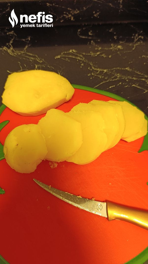 - Haşlanmış patatesleri soyup yuvarlak dilimliyoruz.