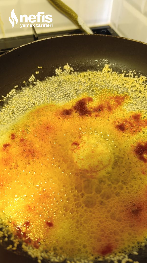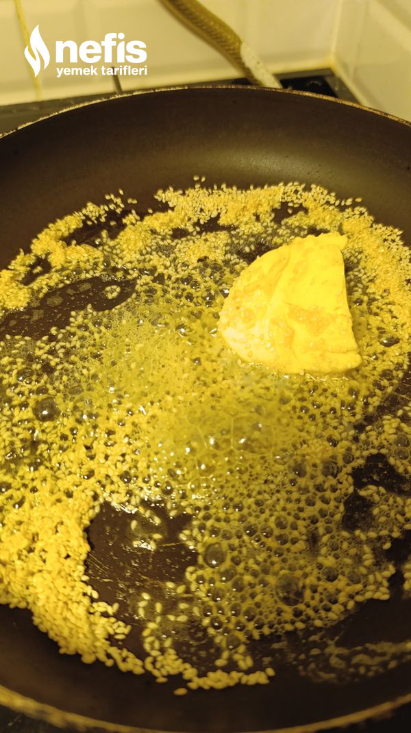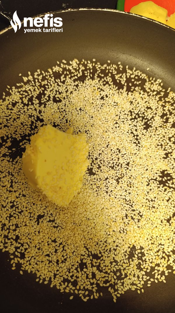 - Tavaya 1 yemek kaşığı tereyağ ve 1 yemek kaşığı susamı alıp karıştırıyoruz.