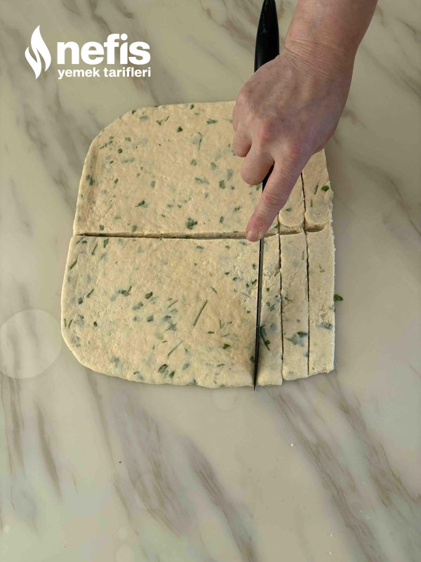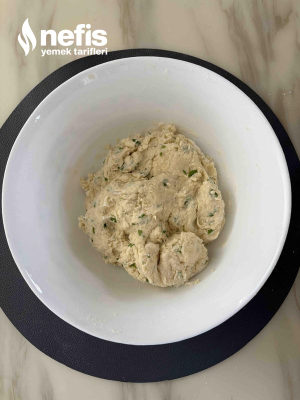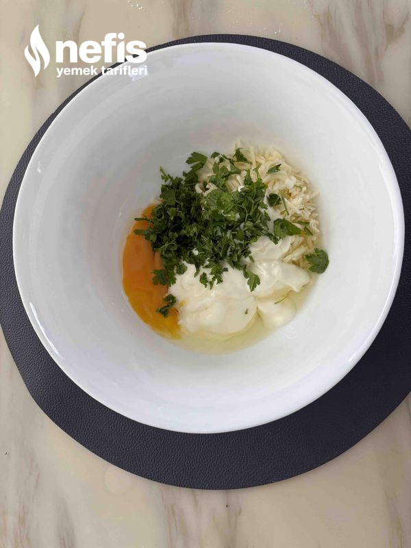 - Sonra yoğurma kabınızın içine kaşar peyniri, beyaz peynir, yumurta, yoğurt, maydanozu, kabartma tozunu ek ediniz en son unu denetimli olarak ekleyip ele yapışmayan çok yumuşak bir hamur yoğurunuz.