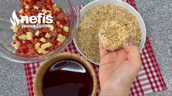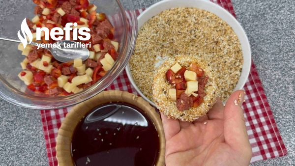 5. Üstü için pekmez ve suyu karıştırın. Poğaçaları evvel bu karışıma, sonra kavrulmuş susama bulayın, sucuklu biberli karışımdan üst kısmına ekleyin.