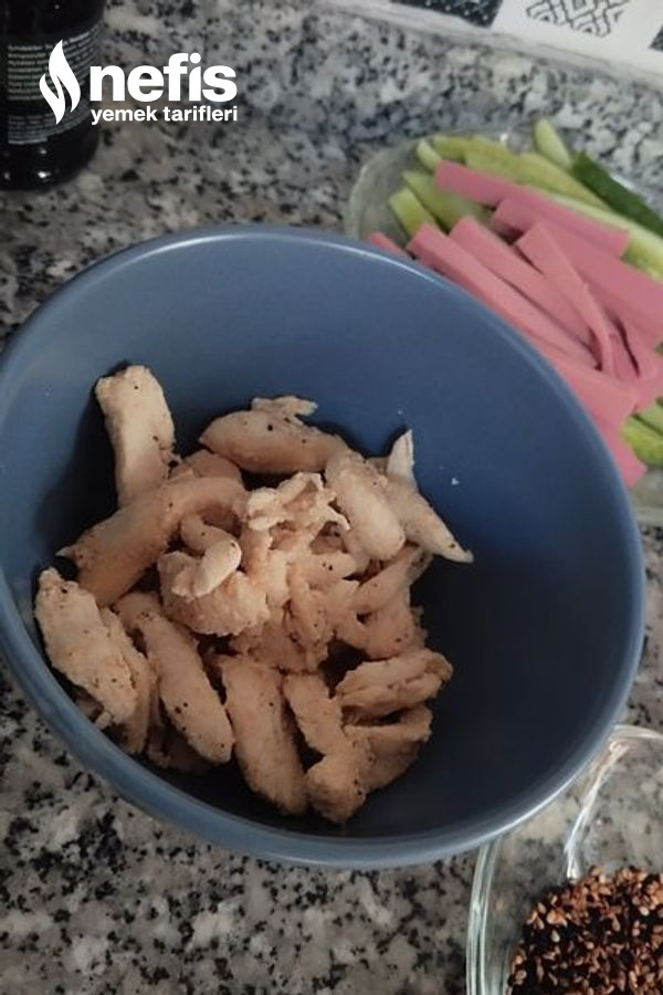 - Diğer yandan iç gereçlerini hazır edelim. Tavuğu ince uzun dilimleyelim. Küçük bir tavaya suyla birlikte alalım. Suyu çekene kadar çiğ kalmayacak formda pişirelim. Pişmeye yakın tuz, karabiber, kimyon ve acı toz biberini atıp biraz kavuralım.