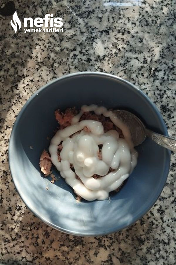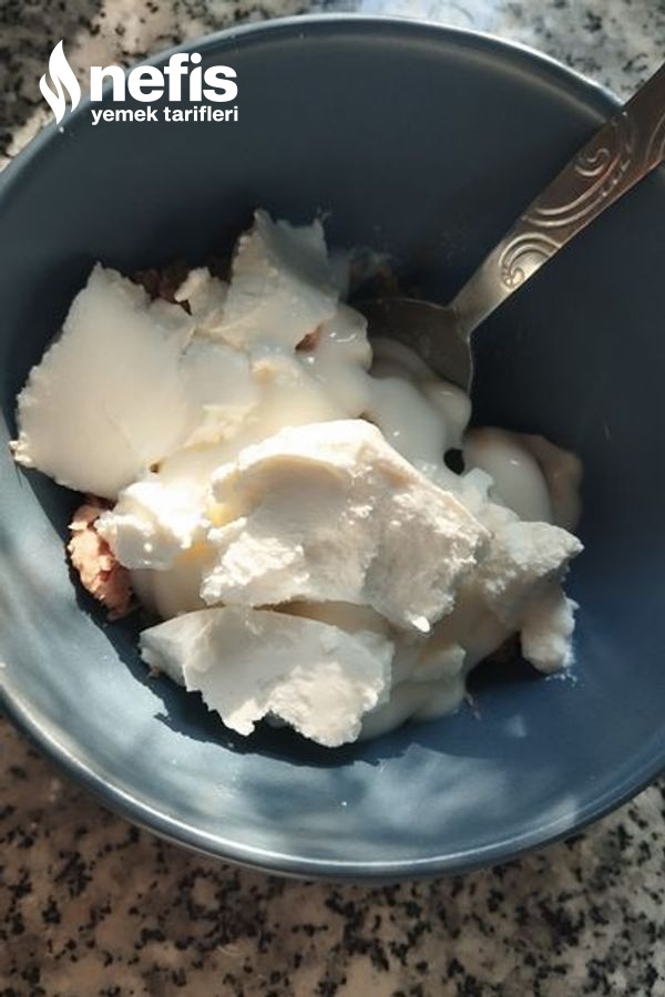 - Ton balığını süzgece alalım. Yağını sıkmasını sağlayalım. Yağını süzdürdükten sonra bir kaseye alalım. Üzerine mayonez ve labne peyniri ekleyip karıştıralım.