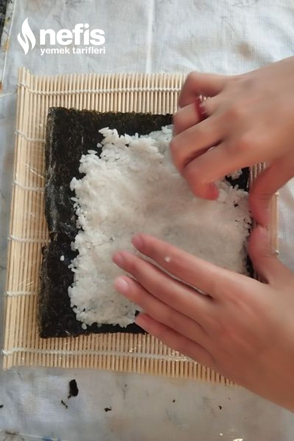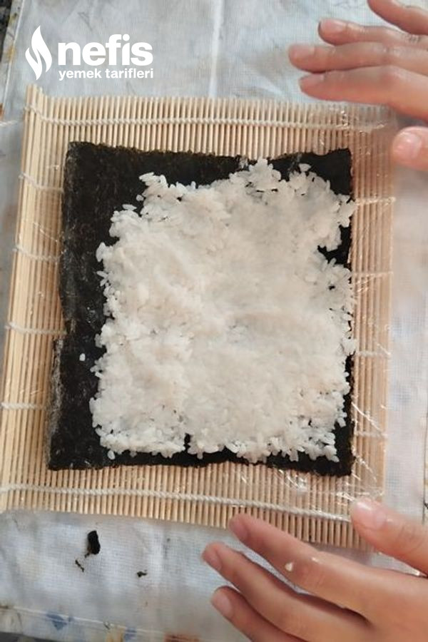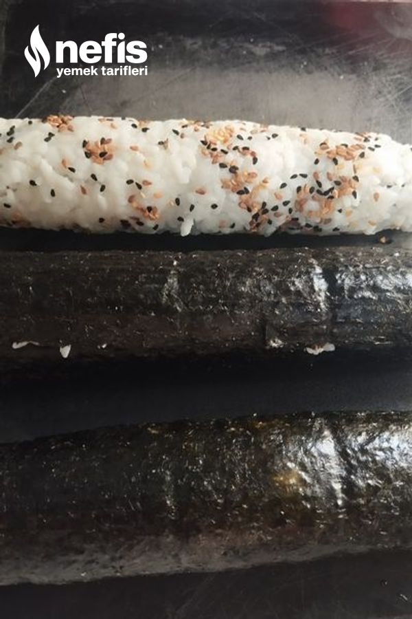 - Ters yapacağımız sushi için ise pirinci tekrar yaprağın üzerine yayalım. Üzerine kavrulmuş susam ve çörekotunu karıştırıp atalım. Sonra yaprağı aykırı çevirelim. Yosun kısmı içte pirinç kısmı dışta olsun. Tekrar birebir biçim içine bırakmak istediklerimizi bırakalım.