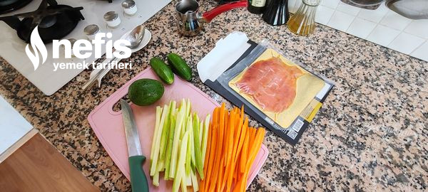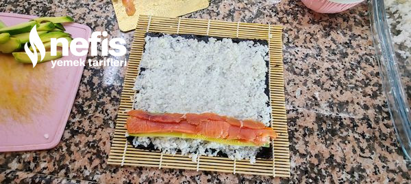 - Baş kısmına dilediğiniz gereçleri (somon, surimi, sebzeler, avokado) yerleştirin.