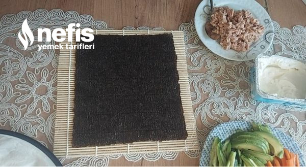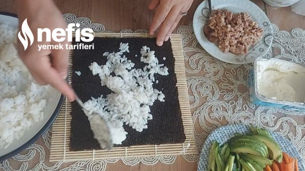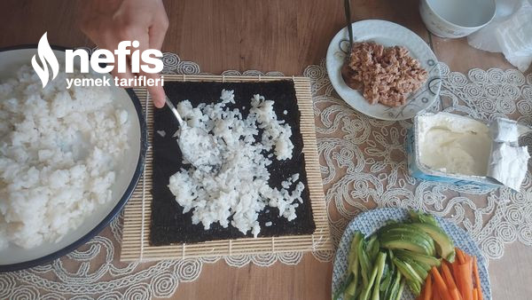 - Üzerine pirinçi yayalım elimizi çok az ıslatalım daha hoş hal alıyor bir ucuna evvel labne sonrasında sırasıyla zerzevatları ve ton balığını koyalım .