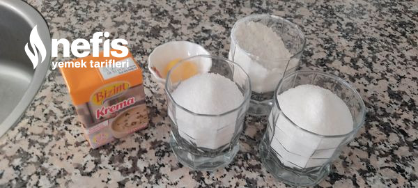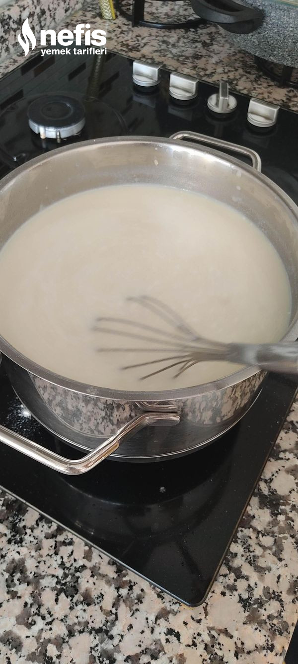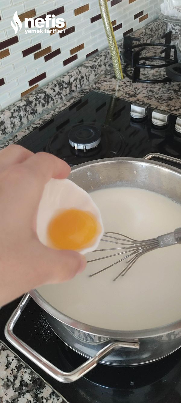 - Süt üzerine eklenir, ısınmadan 1 yumurta sarısı da eklenir kemayıda ekle, 2 su bardağı şeker de eklenerek, durmadan karıştırarak kaynatılır.