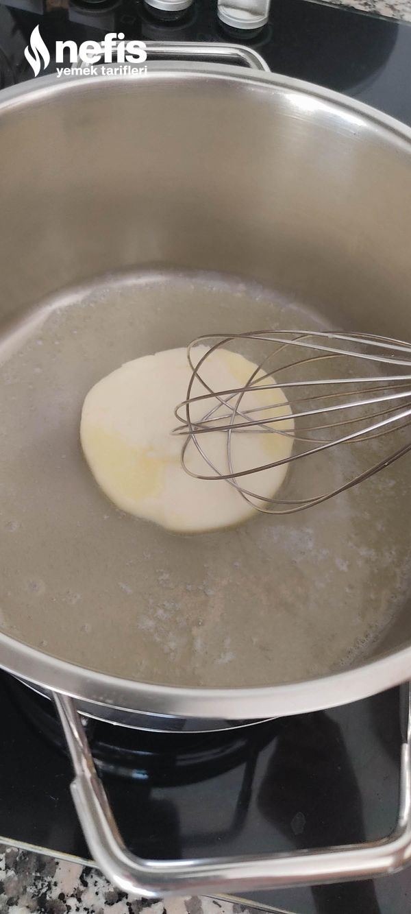 - Tereyağ az ısı ile ocakta eritilir, un eklenerek kokusu çıkana kadar kavurulur.