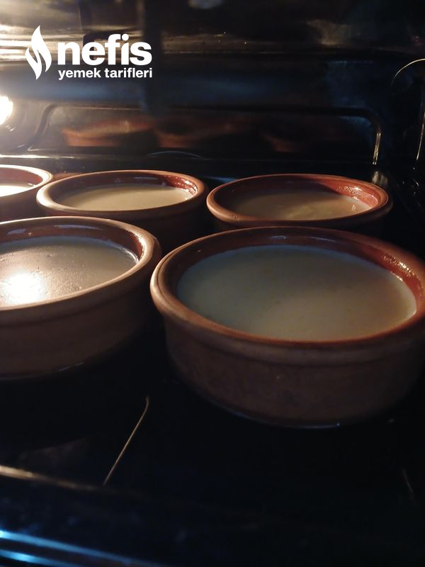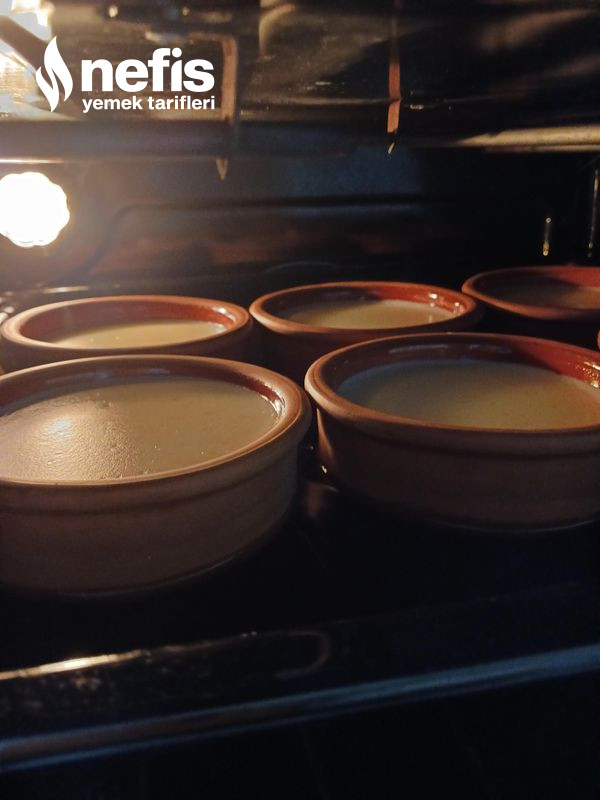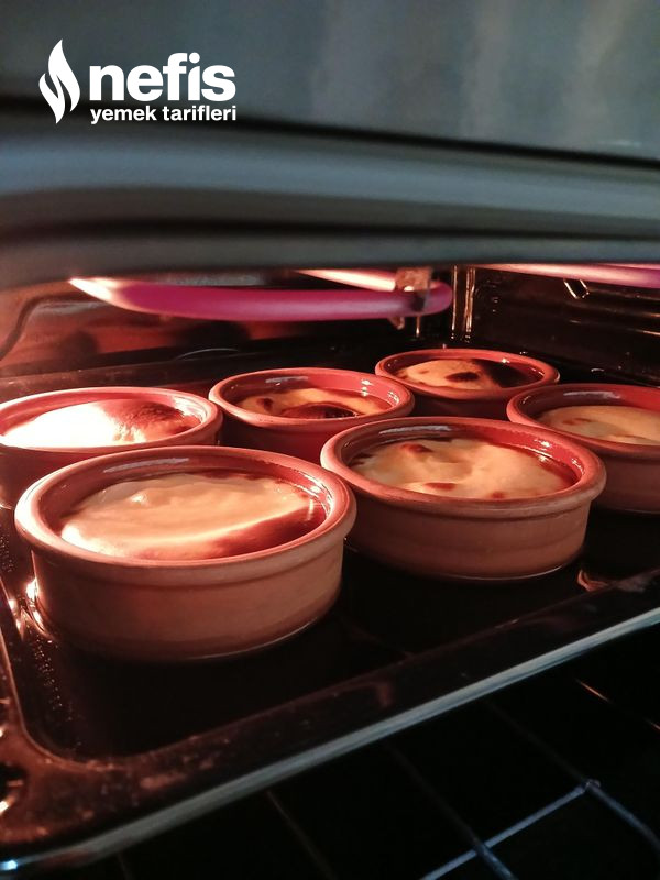 8. Fırının en üst katına tepsiyi koyalım ve fırının yalnızca üst ayarını açıp 15-20 dakika muhallebilerin üzeri kızarıncaya kadar pişirelim.