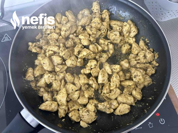 - Sotelenmiş tavuklarımızın üzerine tuz, köri tozu, kimyon, nane, kekik ilave ediyoruz.