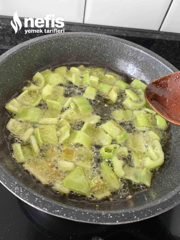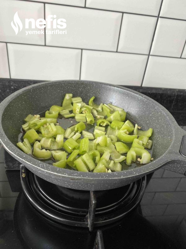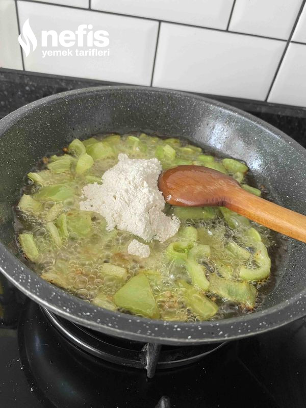 1. Biberlerimizi kesip zeytinyağında kavuruyoruz. Kavrulan biberlerin üstüne bir kaşık unu ek ediyoruz ve karıştırıyoruz.
