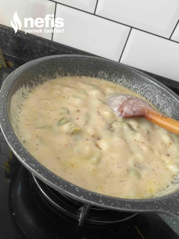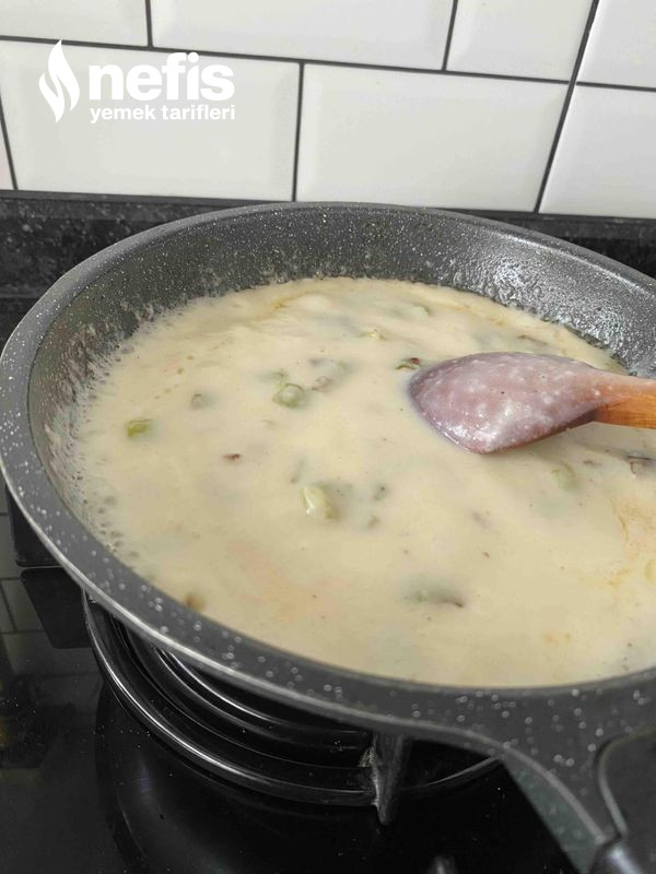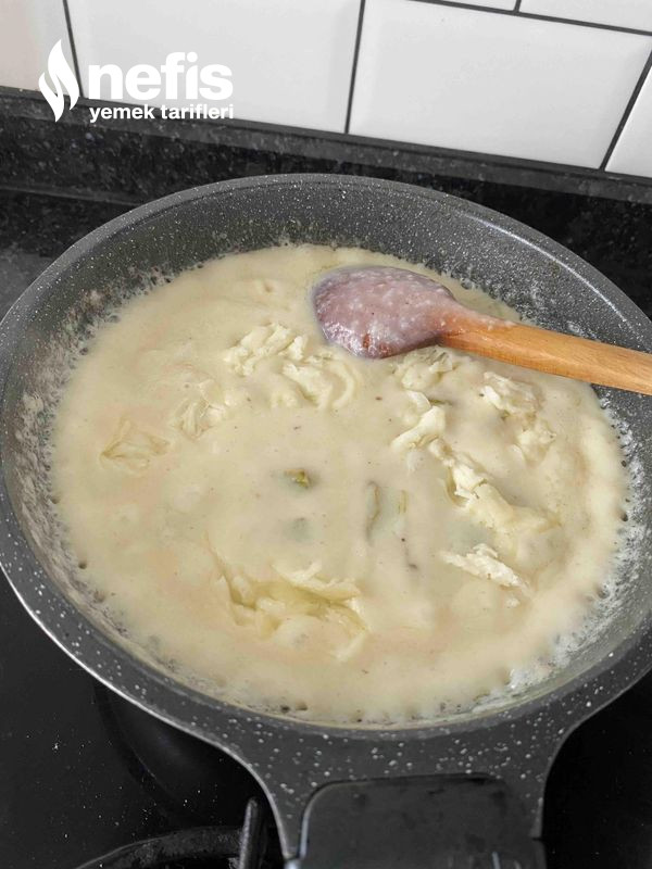 2. Ardından sütümüzü ek edip karıştırıyoruz. Krema üzere kıvam alınca üzerine peynirimiz koyuyoruz.