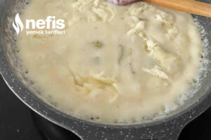 2. Ardından sütümüzü ek edip karıştırıyoruz. Krema üzere kıvam alınca üzerine peynirimiz koyuyoruz.
