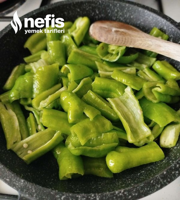 - Biberleri yıkayıp çekirdeklerini çıkaralım ve doğrayalım, tavaya alıp rengi dönüp yumuşayana kadar kızartalım.