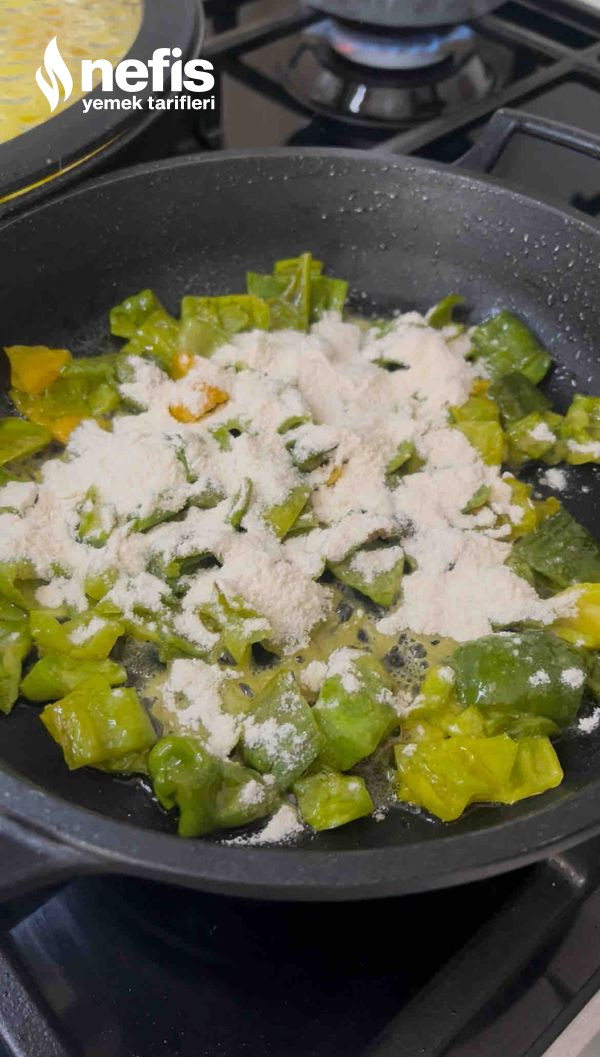 - Ardından biberlerin üzerine unu ek edip bir kaç dakika karistirarak kavuruyoruz.