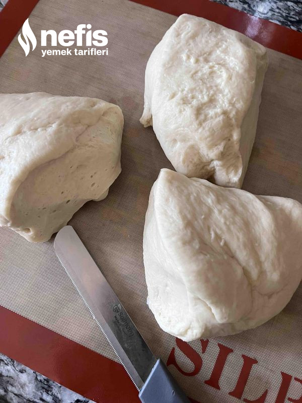 - Daha sonra tuz ve unu azar azar ek ederek yumuşak bir hamur elde edin (unun tamamını eklemeyin unun yarısını ekleyip yoğurun daha sonra azar azar alarak doğurmaya devam edin)