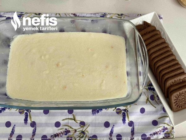 - Kalan muhallebiyi de bisküvilerin üzerine boşaltalım.