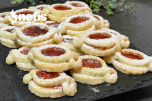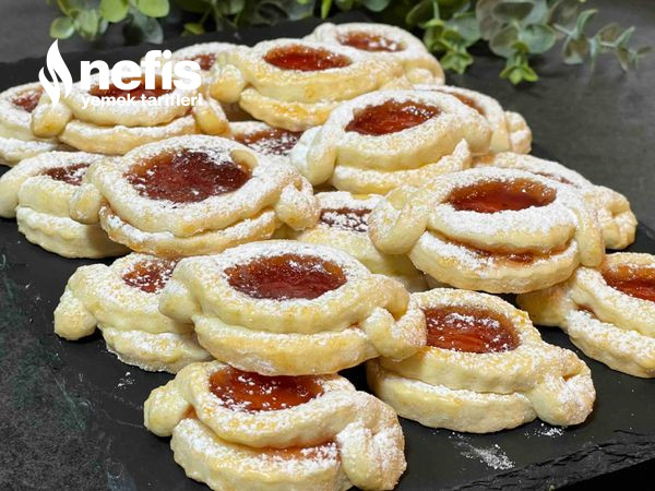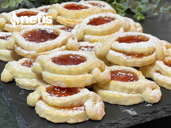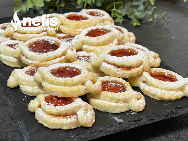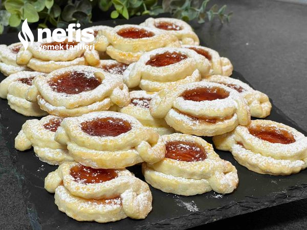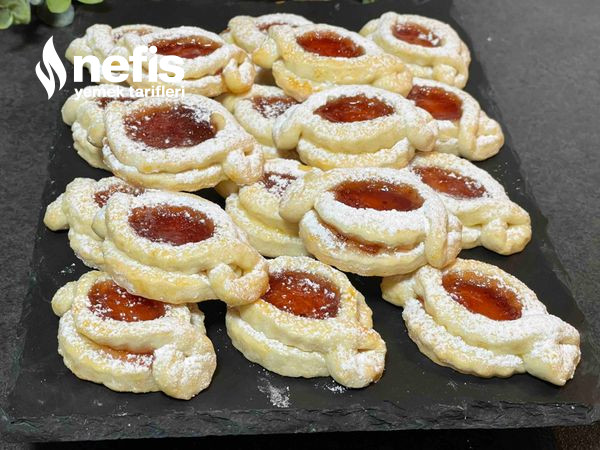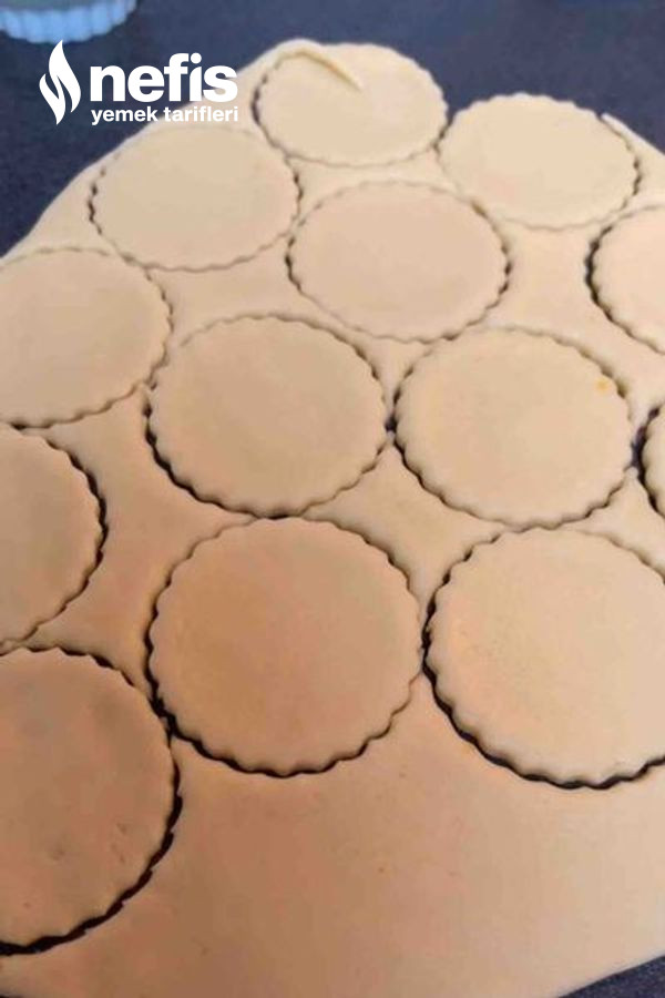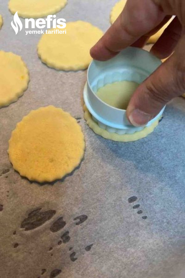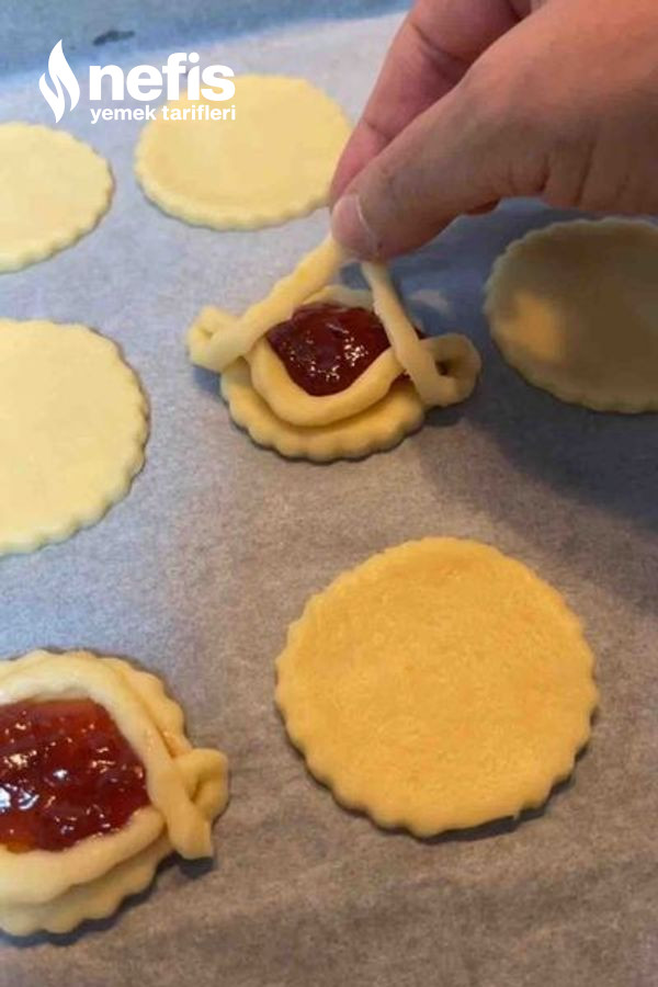 5. Daha sonra hamuru ikiye bölüp oklava ile beş milim olacak halde açın iki adet yuvarlak aparat ile kesip yağlı kağıt serili tepsiye dizin ortasına bir çay kaşığından az reçel koyup görüntü daki üzere form verin .