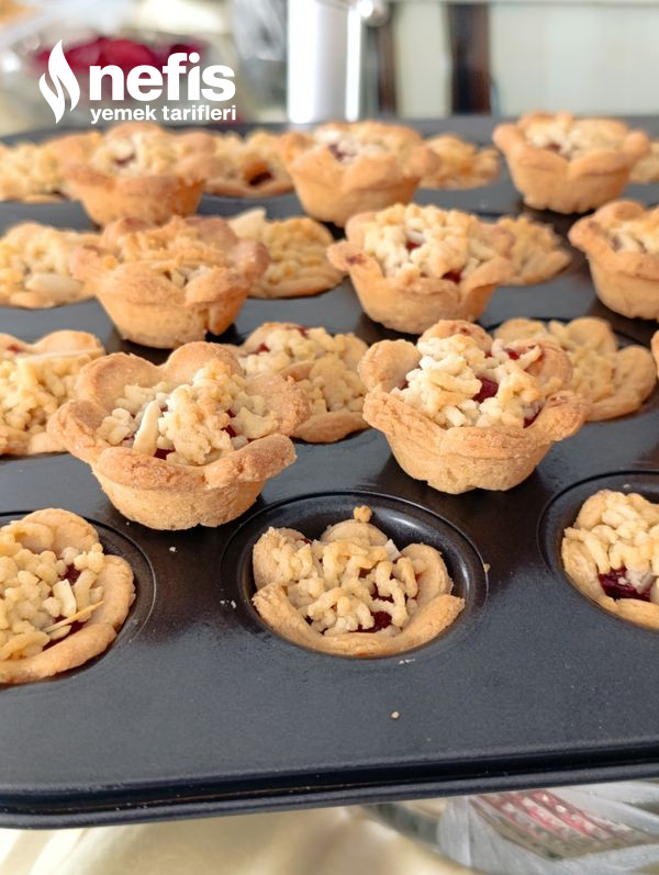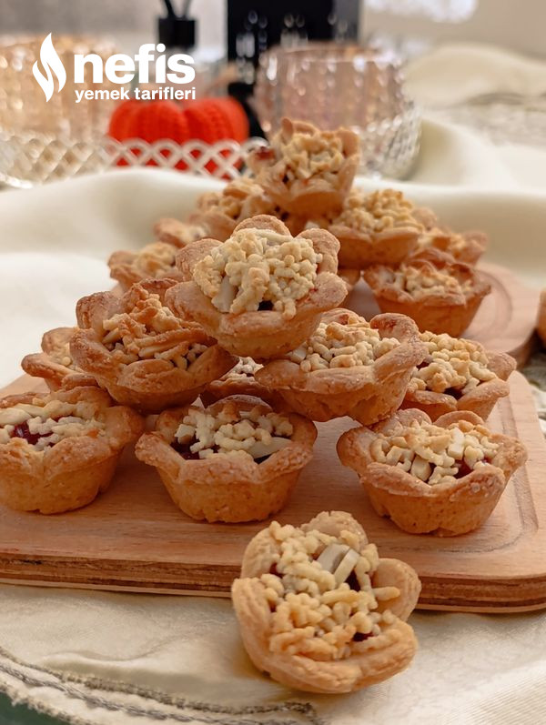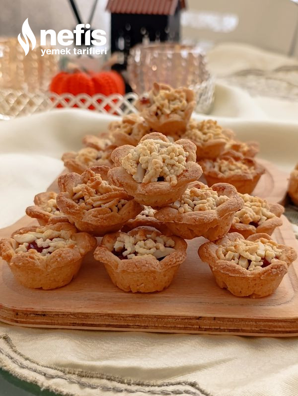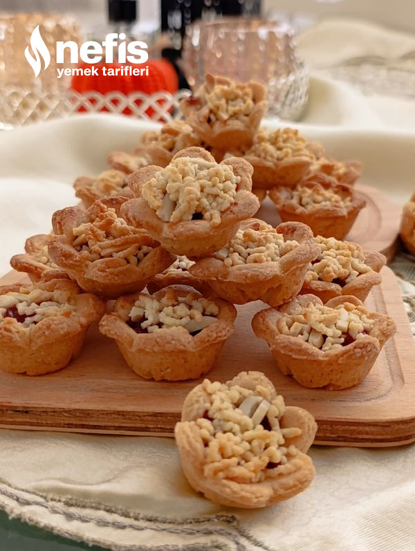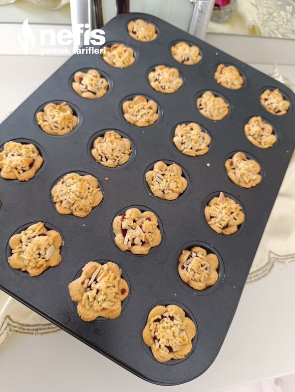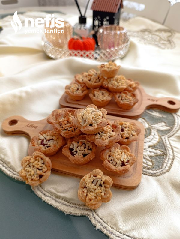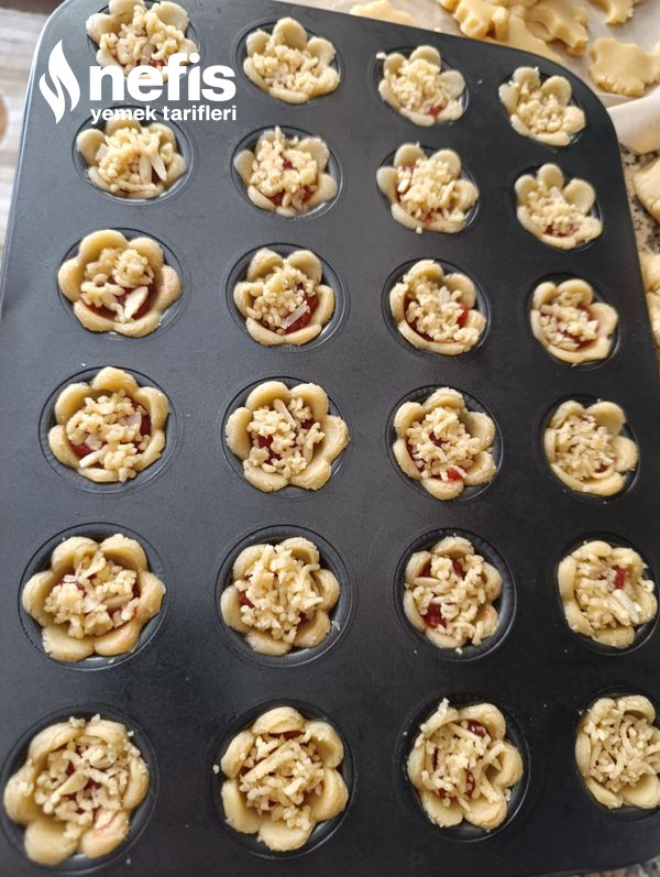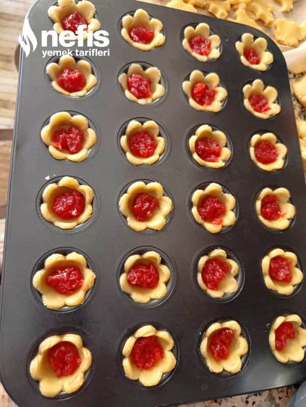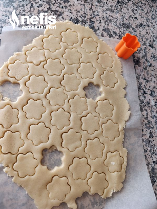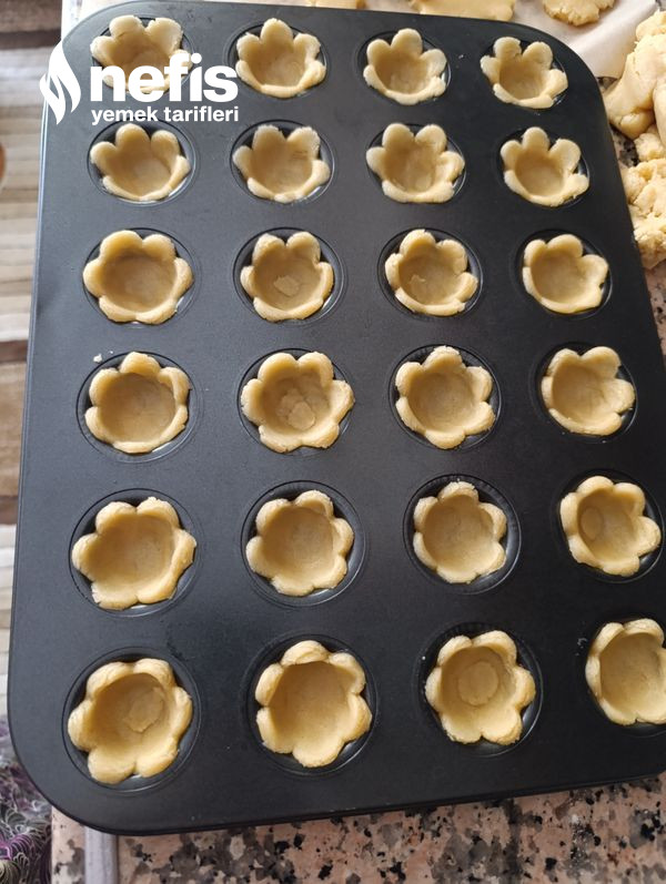- Diğer hamuru iki yağlı kağıt ortasında büyütün, kurabiye kalıpları ile form verin ,ben çiçekli kalıp kullandım, küçük tartolet kalıbına yerleştirin .
