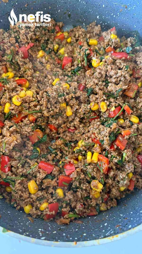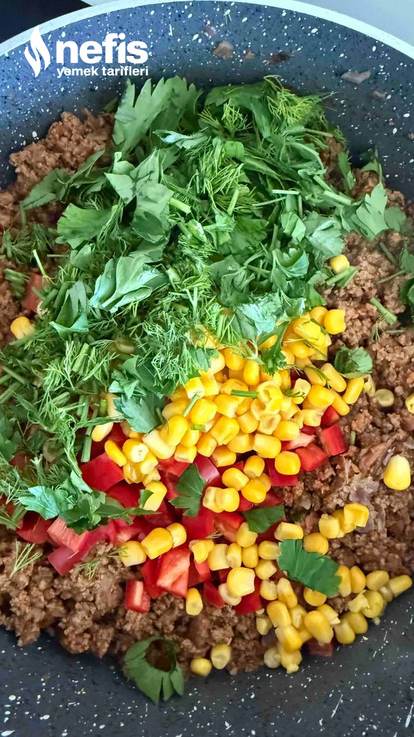 - Mısır, küçük doğranmış biber, kıyılmış maydanoz ve dereotu ekleyip 5 dakika pişirin.