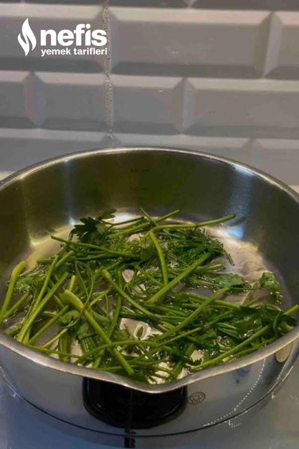 4. Tencereye yeşillik saplarını ve yağı koyalım.