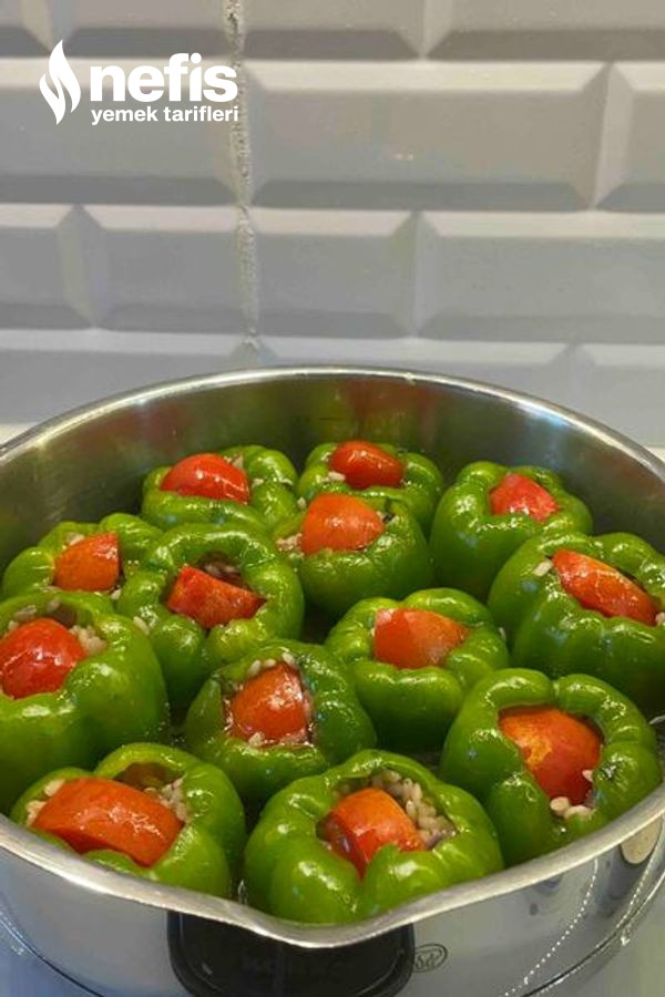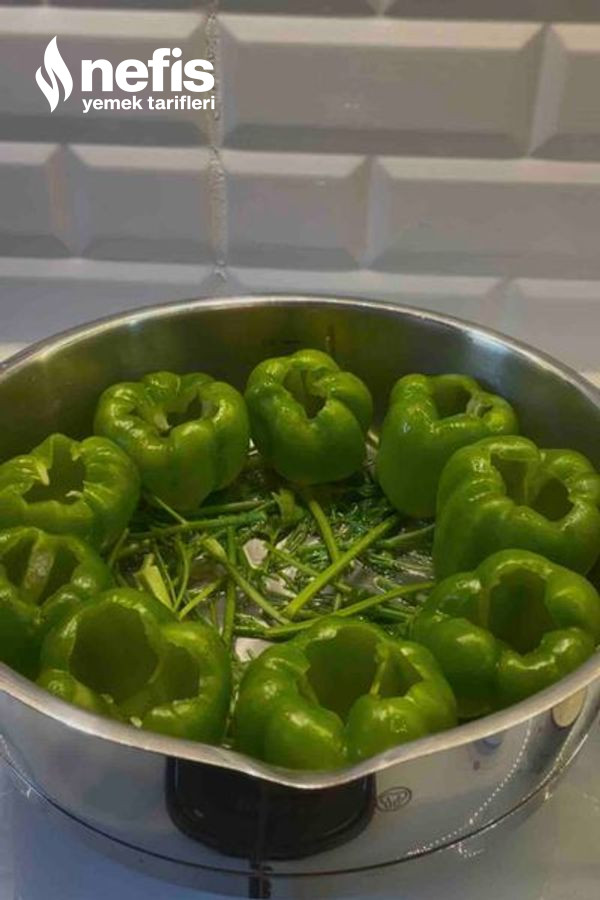 5. Üzerine dolmalık biberleri yerleştirip ocağın altını açalım( içi dolmamış olarak) biraz kızarttıktan sonra harcımızı ekleyip suyunu verip pişirelim afiyet olsun.