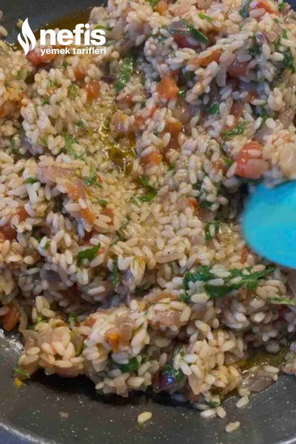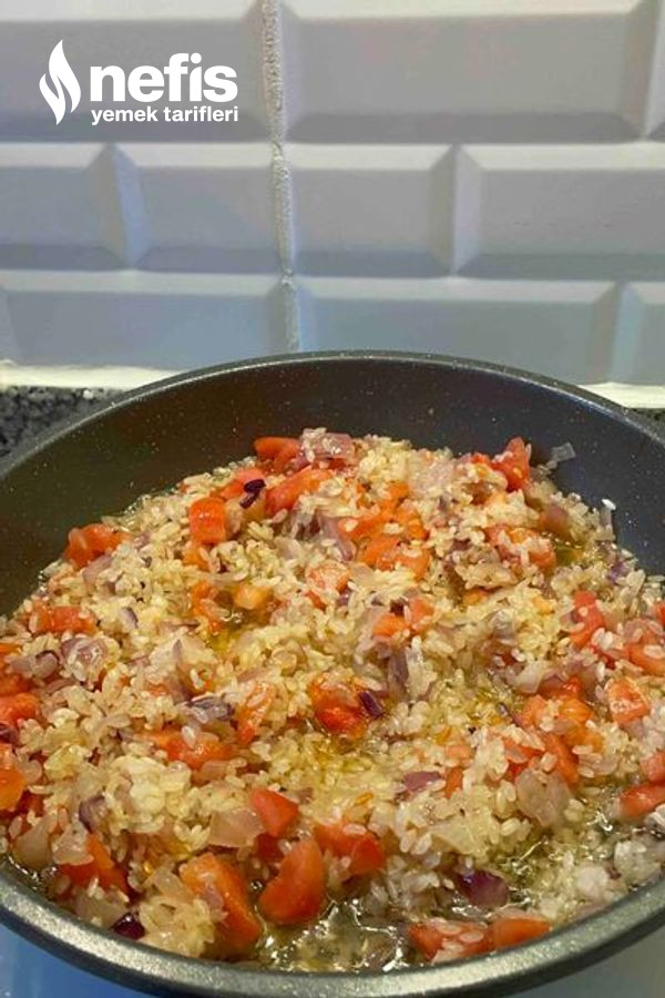 1. Soğanı doğrayıp zeytinyağında kavuralım ,üzerine pirinç ve domatesleri ekleyelim.