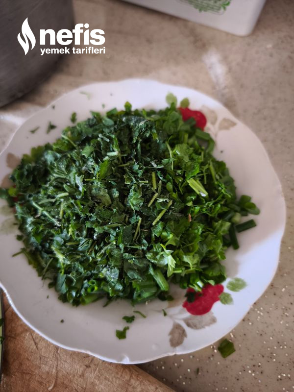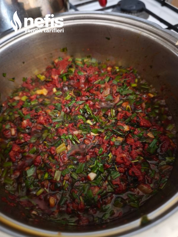 - Salçamızı biraz kavuralım üzerine maydanoz ve yeşil soğanı ekleyelim.