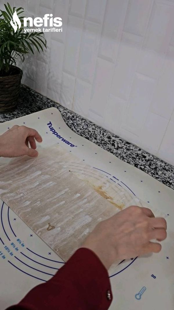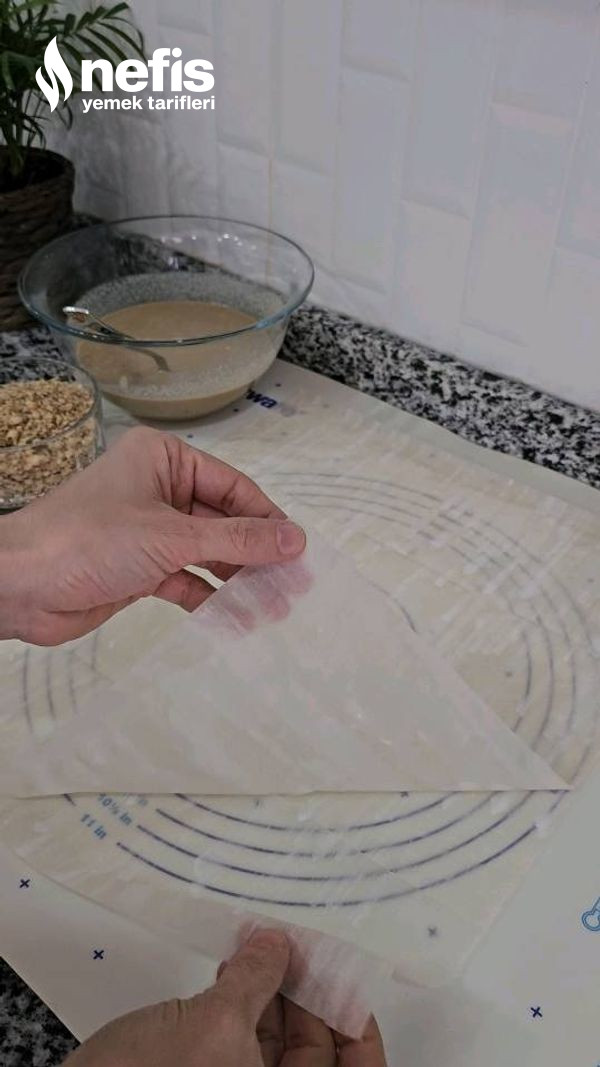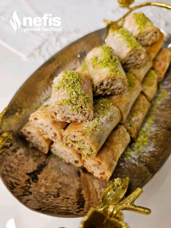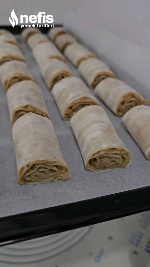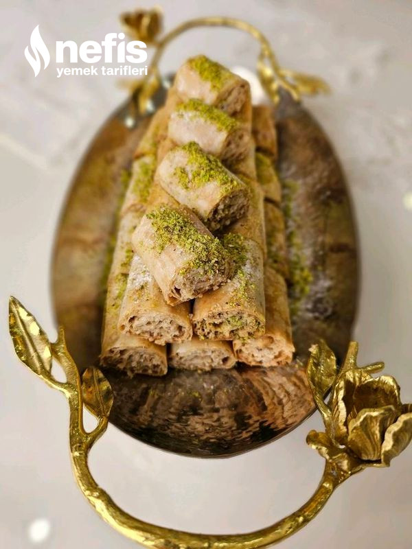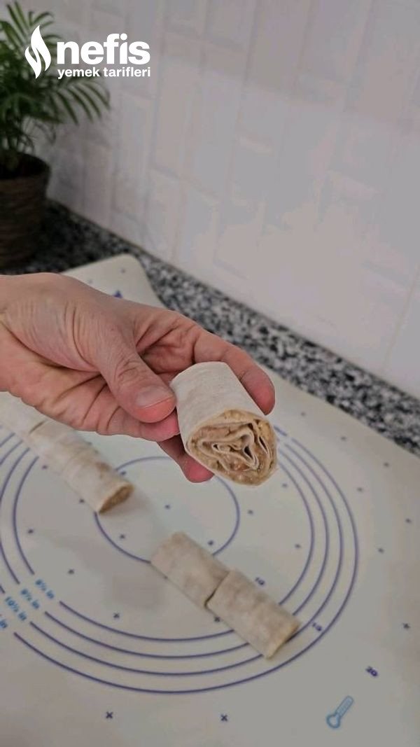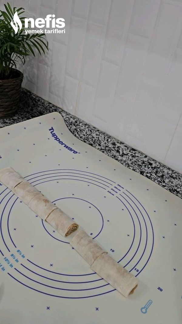 - Üzerine ceviz ve fıstık serpin,baştan sona iki parmak boşluk olacak formda katlayıp rulo yapın.