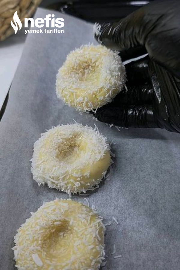 - Hamurumuzdan cevizden biraz daha küçük toplar yapıp evvel yumurta akına daha sonra hindistan cevizine bulayıp ortasını parmağımızla bastırıp çukur açalım.