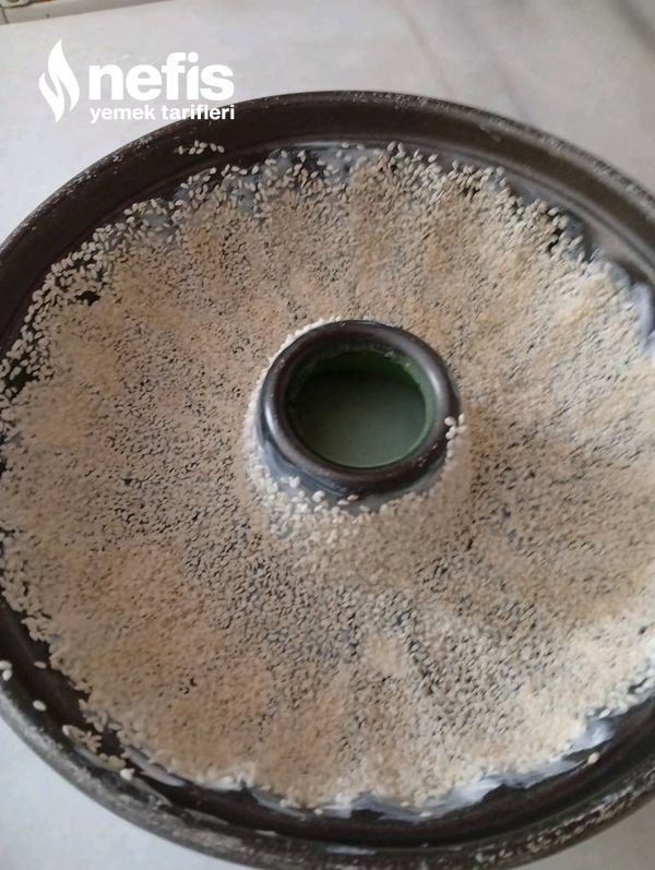 - Tereyağ yahut margarin ile yağlanıp üzerine susam serpilen kalıba dökülür.