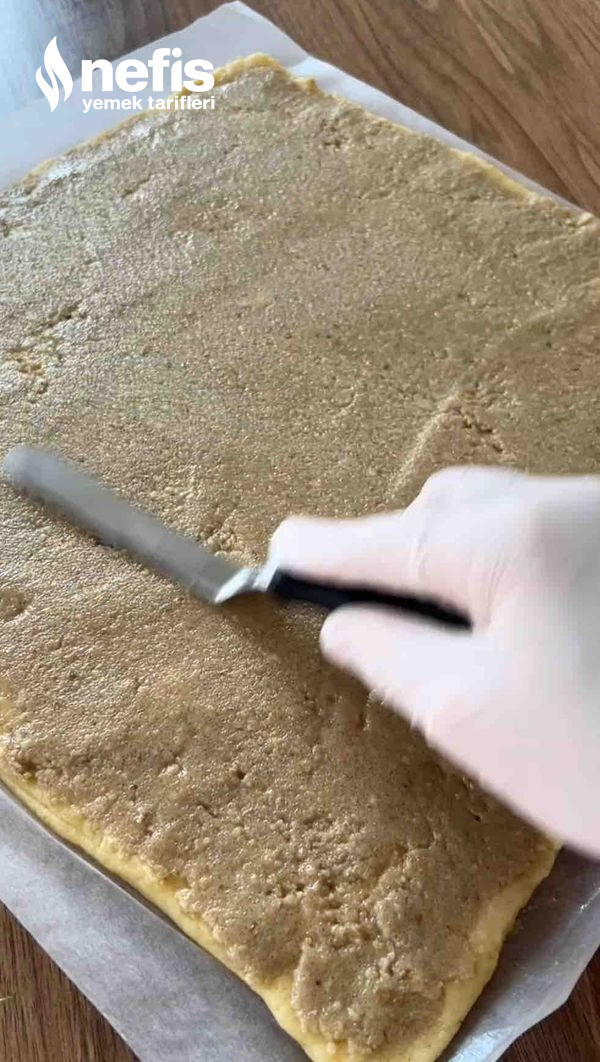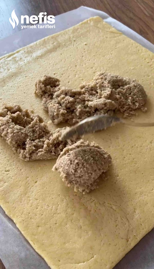 2. Hamuru 2 yağlı kağıt ortasında merdaneyle açalım. Akabinde tahin materyallerini karıştırıp her tarafa eşit olacak formda yayalım. Yağlı kağıtla 2 kat katlayıp keselim. İster kare ister üçgen formda kesip yağlı kağıt serilmiş tepsiye dizelim.