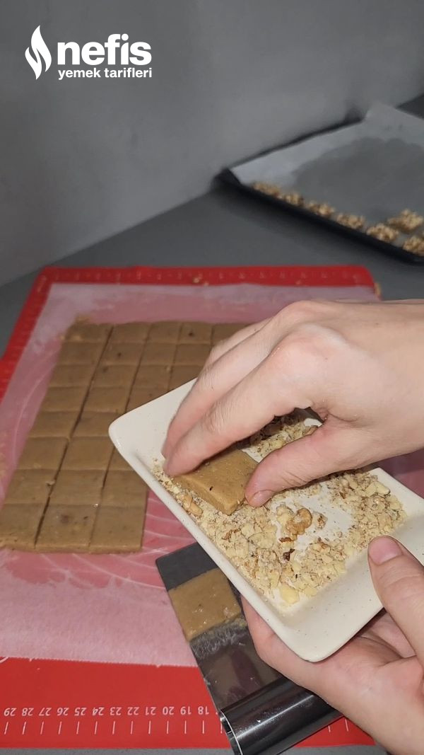 4. Kare halinde kesip evvel yumurta akına sonra cevize bulayıp tepsiye dizelim.