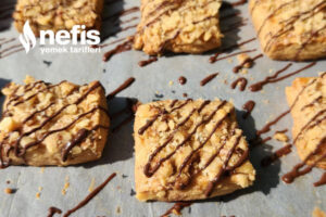 4. Kare halinde kesip evvel yumurta akına sonra cevize bulayıp tepsiye dizelim.