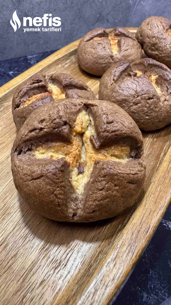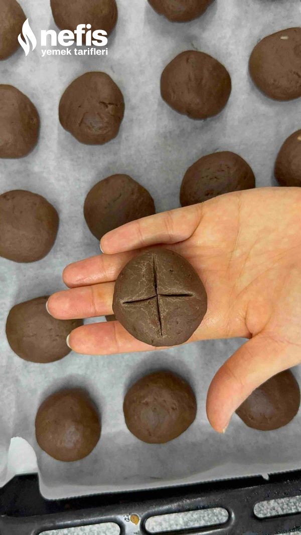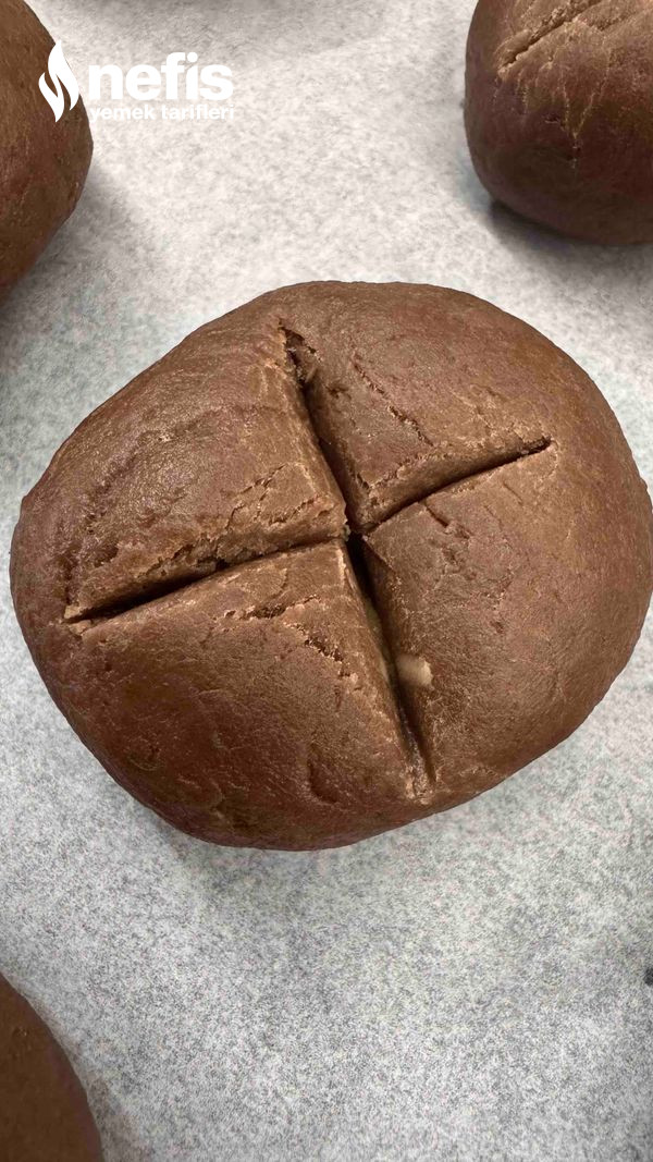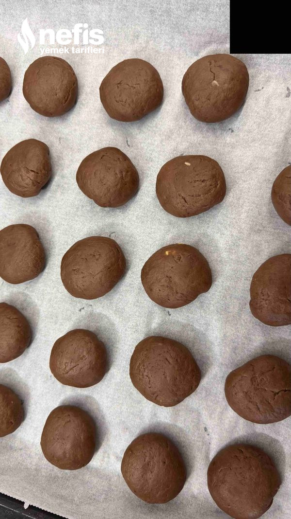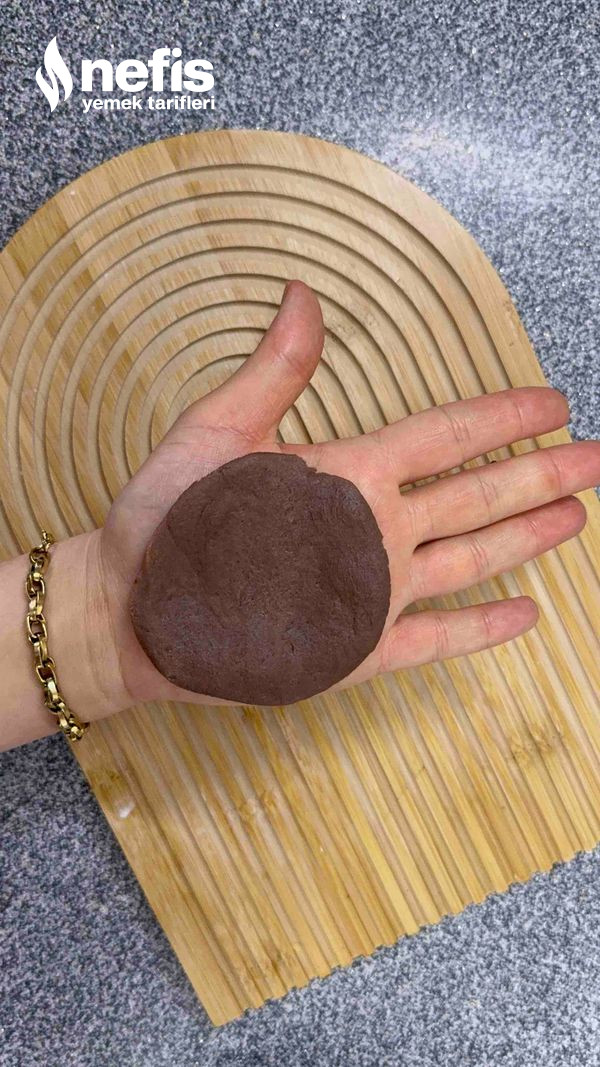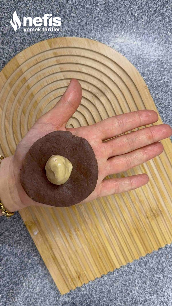 3. Kakaolu hamurdan kesimler kopararak elimizle orta kısmını yassılaştıralım ve tahinli toptan orta kısma yerleştirip kapatalım.