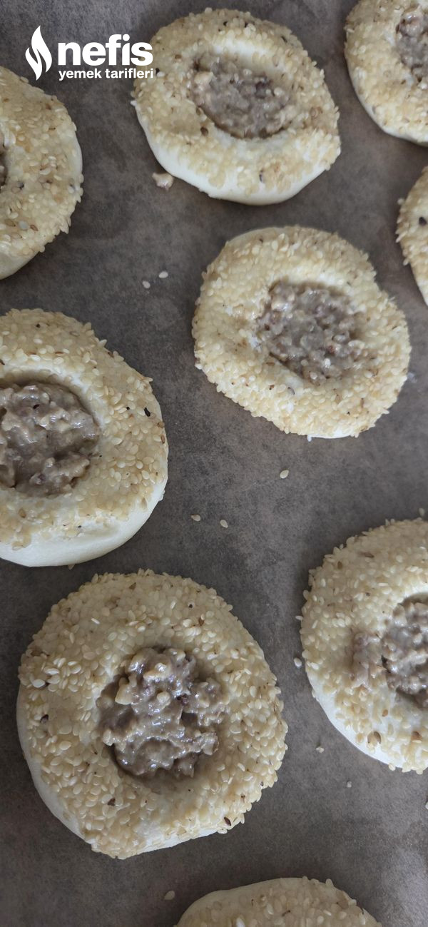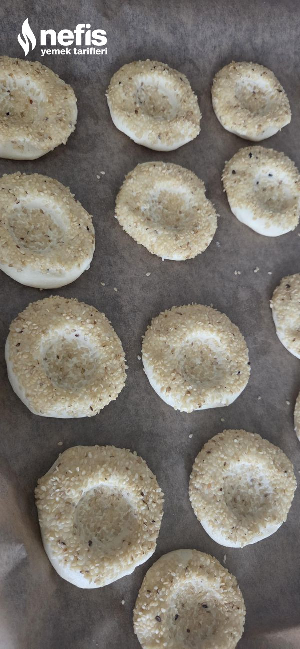 - Hamurdan cevizden biraz büyük hamur kesimi alıp yuvarlayalım hafif elimizle bastırıp susama batıralım ve tepsiye dizelim.