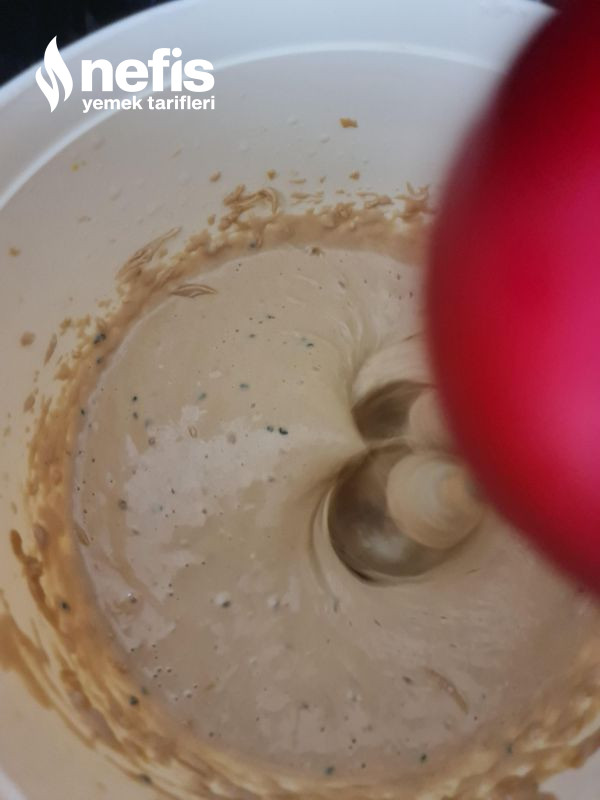 1. Yumurtalar bir kaba alınıp yeterlice çırpılır. Üzerine tahin, kabartma tozu, çörek otu, balzemik sirke ve tuz eklenip karıştırılır. Karışım bu basamakta biraz katı haldedir. Karışıma su eklenip biraz akışkan hale getirilir.